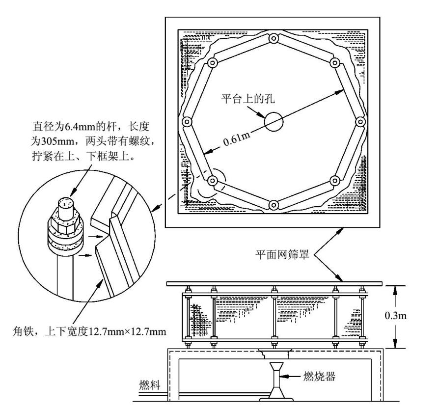 本機(jī)適用于鋰電池(或電池組)耐燃性試驗(yàn)。在一實(shí)驗(yàn)平臺(tái)上鉆一直徑為102mm的圓孔,并在圓孔上放置一鋼絲網(wǎng),將被測(cè)電池置于鋼絲網(wǎng)篩上,在試樣周圍安裝一個(gè)八角形的鋼絲網(wǎng),然后點(diǎn)燃燃燒器,對(duì)試樣進(jìn)行加熱直至電池爆炸或電池?zé)龤橹?,并?duì)燃燒過(guò)程進(jìn)行計(jì)時(shí)。